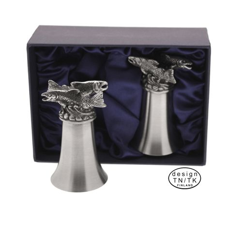 Tyylikäs kalapikaripari silkkivuoratussa lahjapakkauksessa. Hauska kääntöpikari seisoo myös kalojen varassa. Pikari on valmistettu ruostumattomasta teräksestä, joten sen voi ottaa vaikka kalalle mukaan tarvitsematta pelätä pikarin rikkoutumista. Tuote on suomalaista designia. Käytännöllinen lahja kalastajalle.