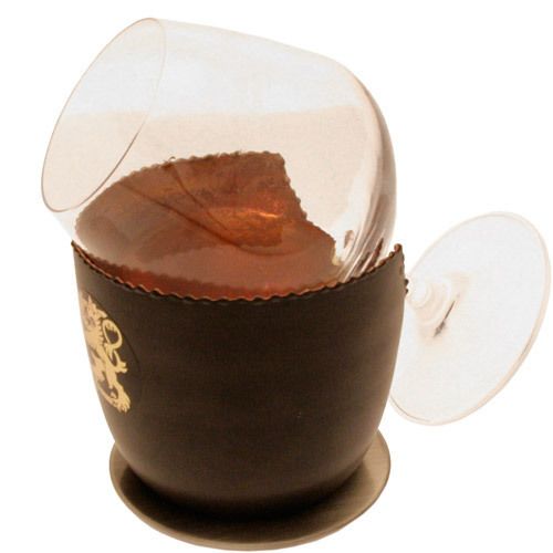 Konjakinlämmitin lasilla, jossa metallinen jalusta ja suomi leijona logo. Jalustan sisäpinta koristeellinen ja tuikun loimutessa kuparin hehku näyttää upealta. Setti sisältää tuikun. Toimitetaan läpinäkyvässä akryylipakkauksessa.