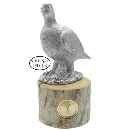 Antiikkihopeoitu riekkopatsas suomalaisen kelotukin päällä. Patsas on tehty liitukeramiikasta, kuparipinnoitettu ja antiikkihopeoitu. Viimeistelynä lakkaus. Sisältää lämpömittarin. Suomalaista designia! Saatavana myös ilman läpömittaria tuotenumerolla 7551T.