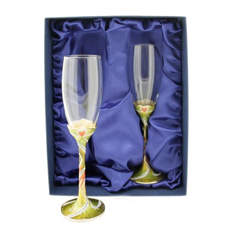 Shampanjalasipari tinajalalla ja sydänkoristeilla. Jalka on kullattu ja epox-maalattu. Jalkaa kiertää noin 100 upotettua zirkonia. Lasi on kiinnitetty jalkaan UV-tekniikalla. Silkkivuoratussa lahjapakkauksessa. Kaunis lahja kihlaparille/ hääparille.