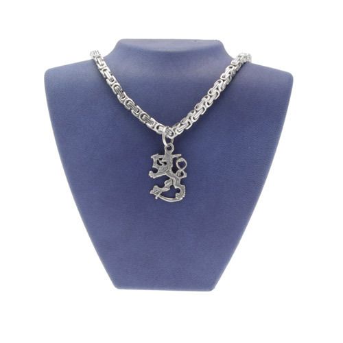 Tyylikäs teräsketju, jossa koristeena tinaleijona. Oiva lahja isänmaan ystävälle.